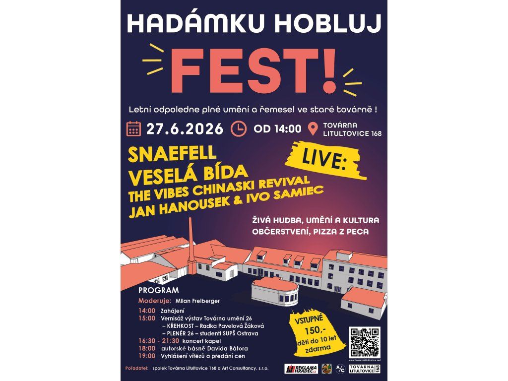 15:00 | Vernisáže „Továrna umění 26“: KŘEHKOST – výstava soch Radky Pavelové Žákové. PLENÉR 26 – výstava děl studentů SUŠ Ostrava vytvořených přímo v továrně. 16:30 – 21:30 | Koncerty & Hudba: Snaefell, Veselá bída, The Vibes Chinaski Revival, Jan Hanousek & Ivo Samiec.